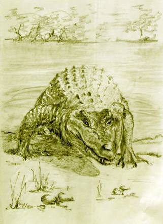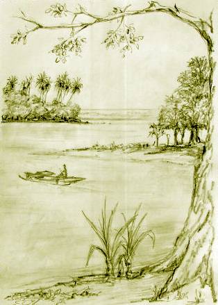 17. When his mind, at last, became more clear He listened in wonder, so as to hear Of Hani's ordeal, which began to unfold As slowly, the gripping tale was told. When her dog was taken by the beast She'd struck out wildly, to the East Clawing her way through the sago stand And the barbed fronds that barred dry land. By the time she reached the other side Raked by thorns and petrified She realised, that the one way back Ran the awful risk of a new attack. For two whole days, she hid in fear Of the monster, lurking to her rear. Yet all was well, as it came about Or so she found, when she ventured out. Of the giant crocodile, there was no sign It had vanished, as if by some strange design And although not dead, it had in fact Removed, to some far off habitat. Tokani, self esteem restored Found his courage, had been its own reward Although Hani, had always seemed to taunt Her affections, she tried hard to flaunt. |