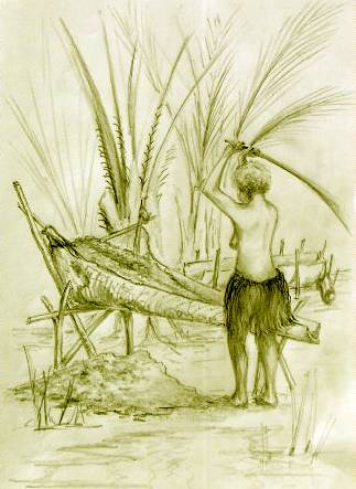 5. Tokani's people had cleared walking paths That joined their gardens and the water baths So through the bush they could move about regain their bearings, when in doubt. The livestock that the tribe maintained Also wandered unrestrained Chickens, pigs and the family pets All shared their food and accoutrements. In fact, all they needed of their daily toil Was the bush, the sea and the fertile soil. So what of life's daily chores In this land of Nature's providors? Well, it fell upon the women's lot To maintain their agricultural plot. Men built houses and garden palisades That prevented the pigs from making raids. Tokani though, he liked to fish For seafood was their staple dish. The craft with which he plied the sea Were lined on the bank of the estuary. |