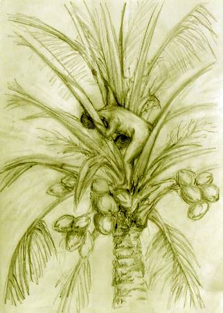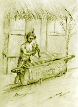6. Just recently he'd help select A tree most suited in this respect. In the shade, he watched a craftsman hew At the log, as he fashioned a fine canoe. Tokani marvelled at his skill Shaping the hull to its builder's will. He was content to watch and patiently wait The canoe would be his to initiate. Around Tokani, village children played While palm trees over their playground swayed. By these gracefull palms, providing shade The agile children usually stayed. They could scurry up to the dizzy top To pluck the coconuts and let them drop. From the green nuts, that sometimes burst They drank the milk, to quench their thirst And the mature nuts, they had learned to husk Satisfied their hunger, until dusk. |