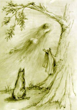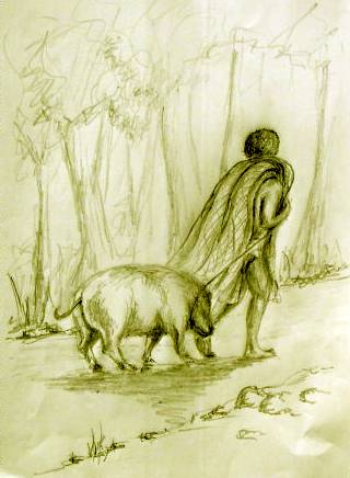 12. From the signs he found, it was Oh! ..so clear As to what had caused her to disappear. And while he continued the search, in vain Thoughts of vengeance, eased his pain. In his mind he devised the plot reversed To kill the predator, that held them cursed. So, without the consent of the elder men He stole a pig, from the village pen And with the largest net, slung across his back He struggled resolute, back down the track. The hapless pig, was soon staked out At the place he'd heard her fearful shout And overhead, the net he strung From the branches there, which overhung And now that the hour was growing late He climbed aloft and began to wait. The leaves whispered in the wind, fireflies twinkled Clouds sheltered the moon and light rain sprinkled The night sounds coaxed his eyelids closed And as the hours slipped by, he quietly dozed. |