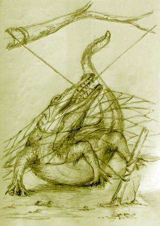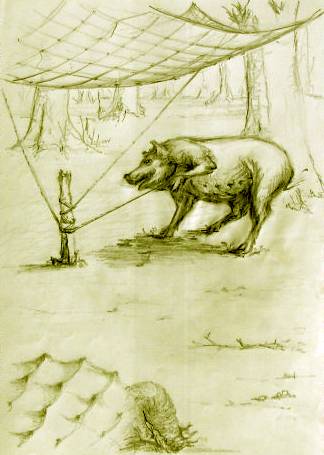 14. Overhead, the young hunter froze As below him, the mighty reptile rose. Across the path swayed it's sure advance That held Tokani in a morbid trance. The tethered pig, now caught the scent And it's squeals could rent the firmament. The cries were stifled by one loud crunch As the powerful jaws, began to munch They jerked the net, that he had hung And the trap was set, and neatly sprung. Although the plan was well prepared It was not designed for the beast it snared. No sooner had the mesh pulled taught The monster sensed it's body caught And the earth exploded, in a swirling rage Unleashed upon that narrow stage. The tether post in the ground, though stout Soon violently, was shaken out But the rope was tied at the other end To the branch he clung, which began to bend. |