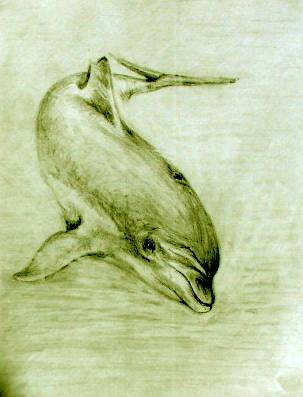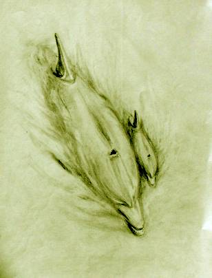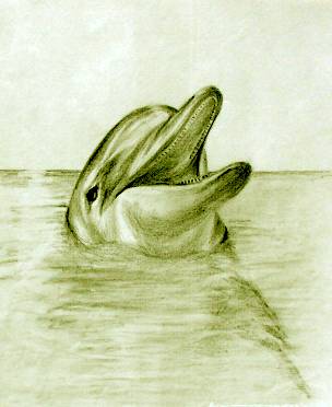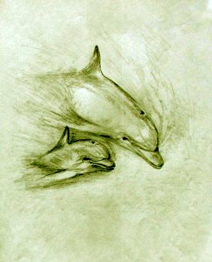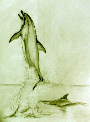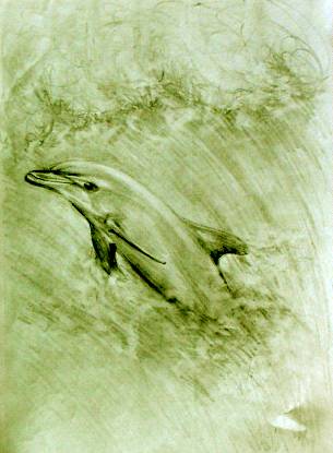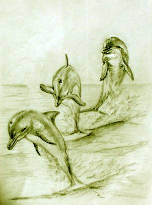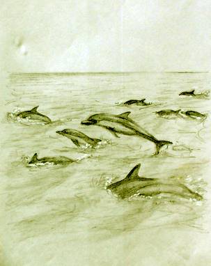 5. Amanda grew, and the school moved out And stayed at sea, for weeks about On the ocean range, the waves grew rough And the young ones soon had seen enough But even in the foam flecked sea The dolphin clan, were masterly. They dived through waves, as high as ships And surfed down troughs, into the rips. Soon, they all were having fun But Mandy, always noticed one A strong young buck, who had no fear And raced them all by flying clear. As she watched, her spirits soared While all around the ocean roared. |
