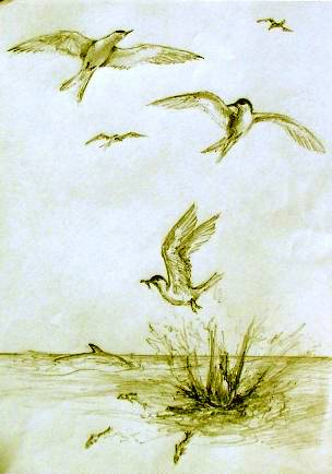 3. Overhead, the birds joined in Flocks of them, made so much din Diving down from great height And slapping the water, with delight Then flapping back into the air For the frantic fish, it wasn't fair. Deeper down, in the water's gloom A shadow lurked, as dark as doom. Aware of danger lingering there The old dolphins warned, Beware! But they did not fear the threatening shape Within the school, was their escape. So close inshore, Amanda played Among the living reef, arrayed In colours of the universe The coral forms were so diverse Laid in bundles, bunched up tight While others swayed towards the light. Some with branches, Oh! so long Wafted, rhythmic as a song. |