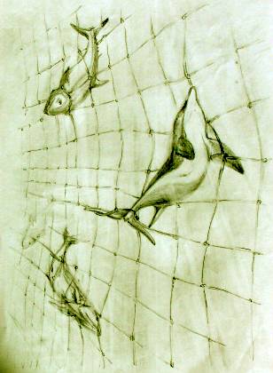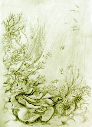 The coral reef was their domain That all around the palm trees framed. In this place, where the sun shone free And the water was clear, as the eye could see They lived and played without a trace Of the greedy hand of the human race. Time passed without a care In the ocean harvest, all could share Its cycle of life soon betrayed In a shimmering, silver shape displayed The teeming fish, were a seething mass The larger fish could all harass. Feeding time was so much fun When all the family, worked as one Rounding the churning schools as tight As the shining moon, in the sky by night. Each in turn, they all would dart Into that orb, that burst apart Snapping here, snapping there As little fish rushed everywhere. |