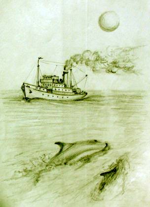 7. In this way, the days elapsed And life went on, till the next moon waxed. While cruising on one moonlit night A strange new creature, hove in sight This behemoth belched, thick, black, smoke That hung behind it, like a cloak. Its sharp nose, cut the surface, clean And pushed out waves, along its beam. The dolphins, watched the ship change pace And all at once, agreed to chase This giant, from the other world That steamed along, with wake unfurled. They overtook, by swimming fast And in the moonlight, very soon were past |