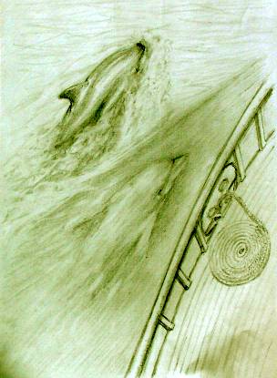 12. With panic, Mandy loudly squealed As the large grey shadow slowly wheeled And while the evil eye looked back It launched itself, on a new attack. No longer at her Mother's side Amanda had no place to hide. Resigned to a gruesome fate She closed her eyes, the end to wait. In darkness and with death so near The faint alarm, was hard to hear A single challenge, Could it be? Came surging, through the lonely sea. Amanda dared a furtive glance At once, felt all her nerve end dance A champion to her cause Stormed into view, without a pause. |