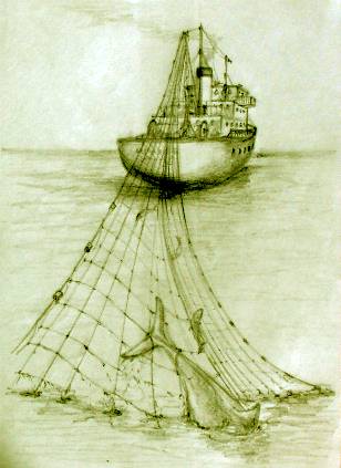 8. They heard the heavy engine drum And the wind, that made the rigging hum Around the ship, they swam astride Into the big bow wave, to glide Throwing out fluorescent light Like shooting stars, but twice as bright. All was not as it might seem Of this monster, that appeared a dream. A relic, of that fateful night Was waiting randomly, the plight Of anything that ventured near And who tried to pass, the veil of fear. Strung for miles, across their path A drift-net hung, an aftermath. |