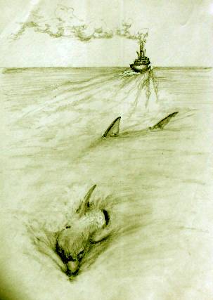 In and out, the dolphin dashed And from every point, harassed. But even though he was so fast The uneven duel just couldn't last And as the great mouth open slashed The dolphin's dorsal fin was gashed. Now his strength was wearing out And soon, it would become a rout. Just as it seemed that all was lost And Chuck had fought, at such a cost Suddenly, in a burst of sound A cavalcade came bearing down. The dolphins, rallied from their plight Came charging in, to join the fight. From every side they rammed the shark As it sank slowly back, into the dark In death, it finally rolled free And drifted ... to eternity. |