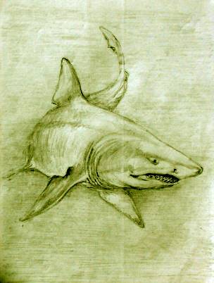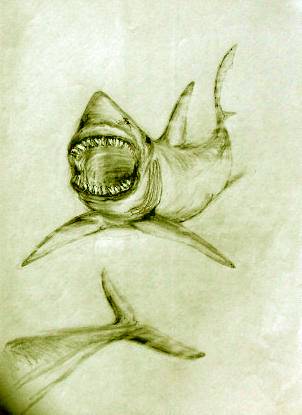 | 11. The menacing shadow, always near With the trouble, ventured to appear. She felt the icy water rush And saw just off, the cold jaws crush A victim of that dreadful snare Swallowed down, with one sharp tear. Amanda's terror now was real The creature looked for another meal. A little dolphin, alone and ill! The shark homed in, for an easy kill. The ugly jaws, lined razor white Opened, for a savage bite But as those fearful teeth gaped wide She lunged desperately, aside. |